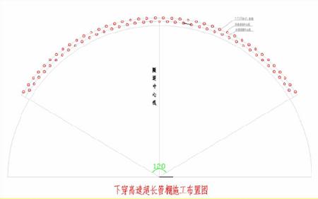 大方隧道下穿杭瑞高速公路,下穿段采用CRD法施工,控制爆破開挖。本下穿地段屬融蝕峰叢洼地及剝蝕低丘地貌,丘包低緩,存在溶洞。管棚采用有線導(dǎo)向監(jiān)測,楔形板糾偏水循環(huán)鉆進(jìn)工藝。結(jié)合現(xiàn)場施工及水文地質(zhì)情況,決定在該下穿段設(shè)一環(huán)?108mm雙層大管棚,分別在下穿隧道開挖線輪廓線外側(cè)0.2m(內(nèi)排)和0.4m(外排)布置管棚入口,梅花形布置;每根管棚長為40m,管棚中至中間距0.4m,共80根,單孔打設(shè)長度80米;管棚鋼管壁厚6mm,環(huán)向設(shè)置為拱墻120°范圍。