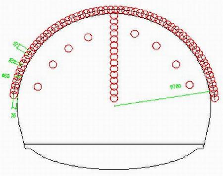水平旋噴樁布置在隧道斷面180度范圍內(nèi),單樁長度20,樁徑600mm,樁間距為400mm,相鄰樁相互咬合200mm,每循環(huán)搭接5 m。施工采用新開發(fā)的水平旋噴臺車及雙膠管通道旋噴鉆具,一個往復行程成樁20,無需進行鉆桿拆卸,大大提高了施工工效。左右線兩部臺車四臺鉆機交替作業(yè)有效的保證了張承高速控制性工程的施工進度。